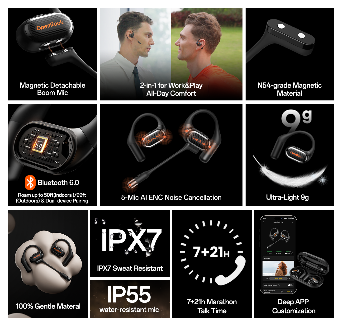 OpenRock Link 20: The First 2-in-1 Open-Ear Earbuds with Detachable Magnetic Mic for Work & Play